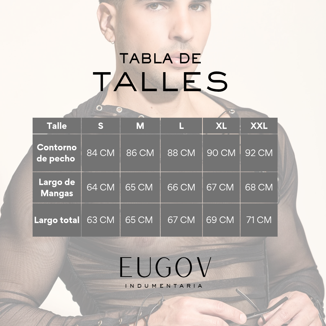 Una pieza que fusiona sensualidad y carácter. Confeccionada en microtul translúcido, esta remera se adapta al cuerpo generando una silueta intensa y expresiva. Los apliques de acero y las tiras de ecocuero aportan estructura, contraste y un detalle distintivo que eleva la prenda.