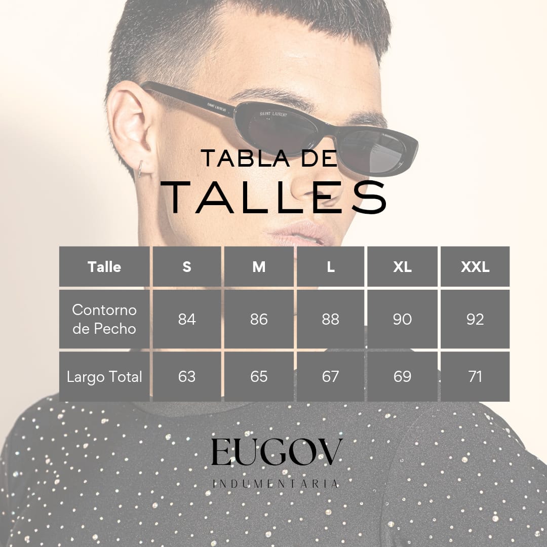 - Las medidas expresadas en la tabla se toman con la prenda en reposo, la tela es elástica, al usar estirará aproximadamente 5 cm más.